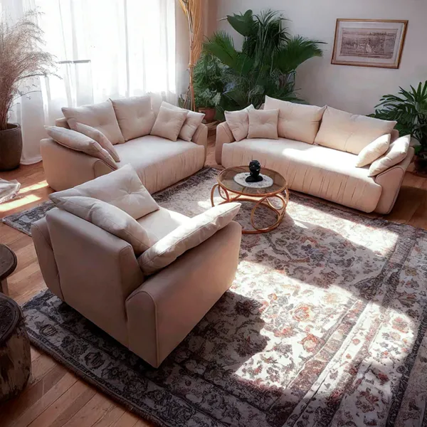 يجلب هذا النموذج لمسة من الدفء إلى غرفة المعيشة بفضل تغطيته بأقمشة ناعمة وعالية الجودة.